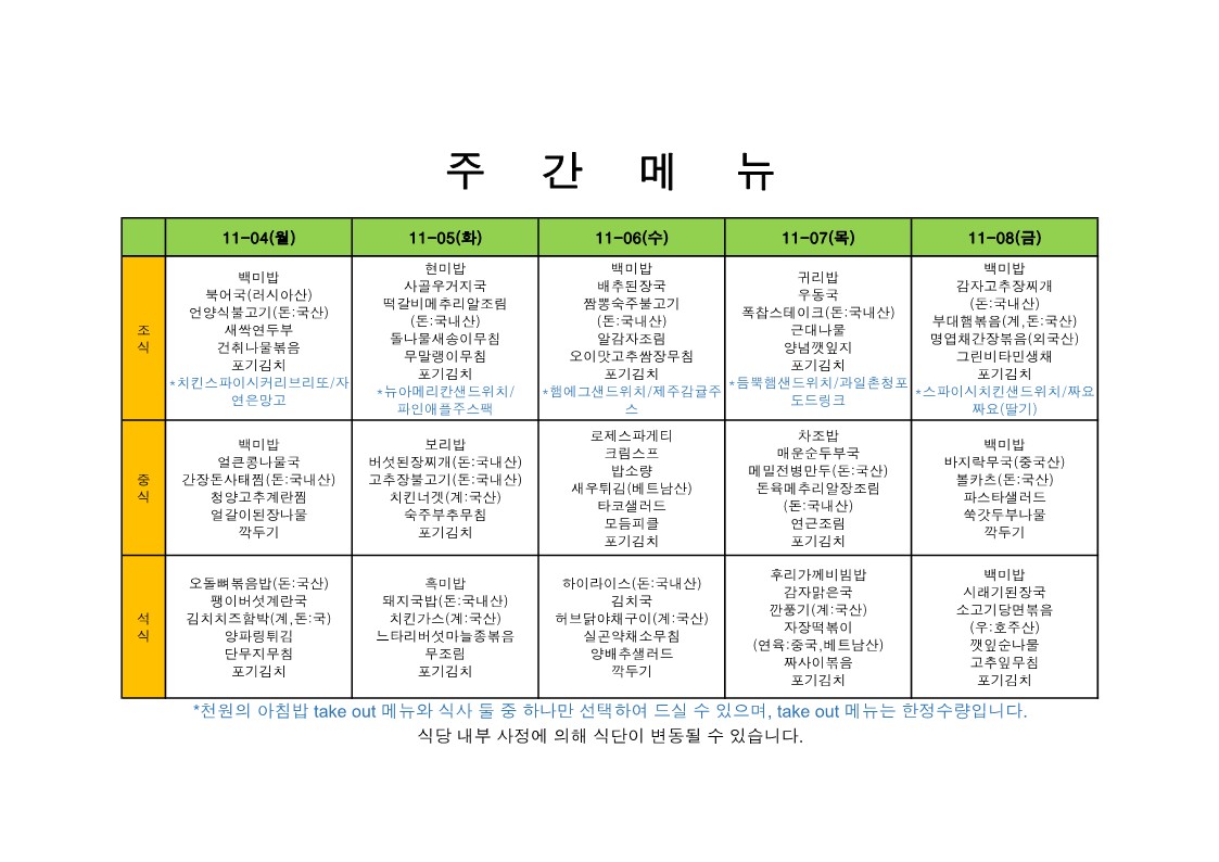 2025. 11. 03. ~ 2025. 11. 07. 주간식단표