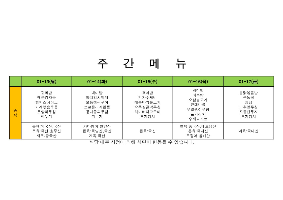 2026. 1. 12. ~ 2026. 1. 16. 주간식단표