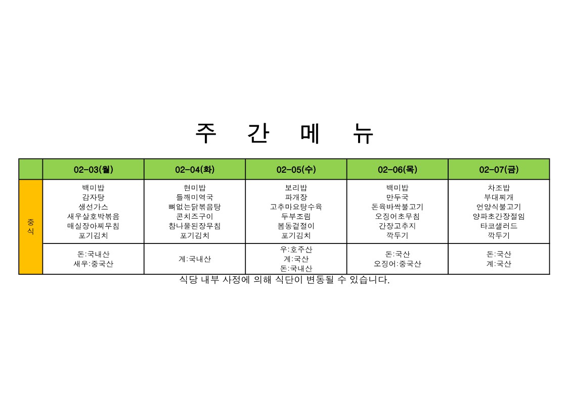 2026. 2. 2. ~ 2026. 2. 6. 주간식단표