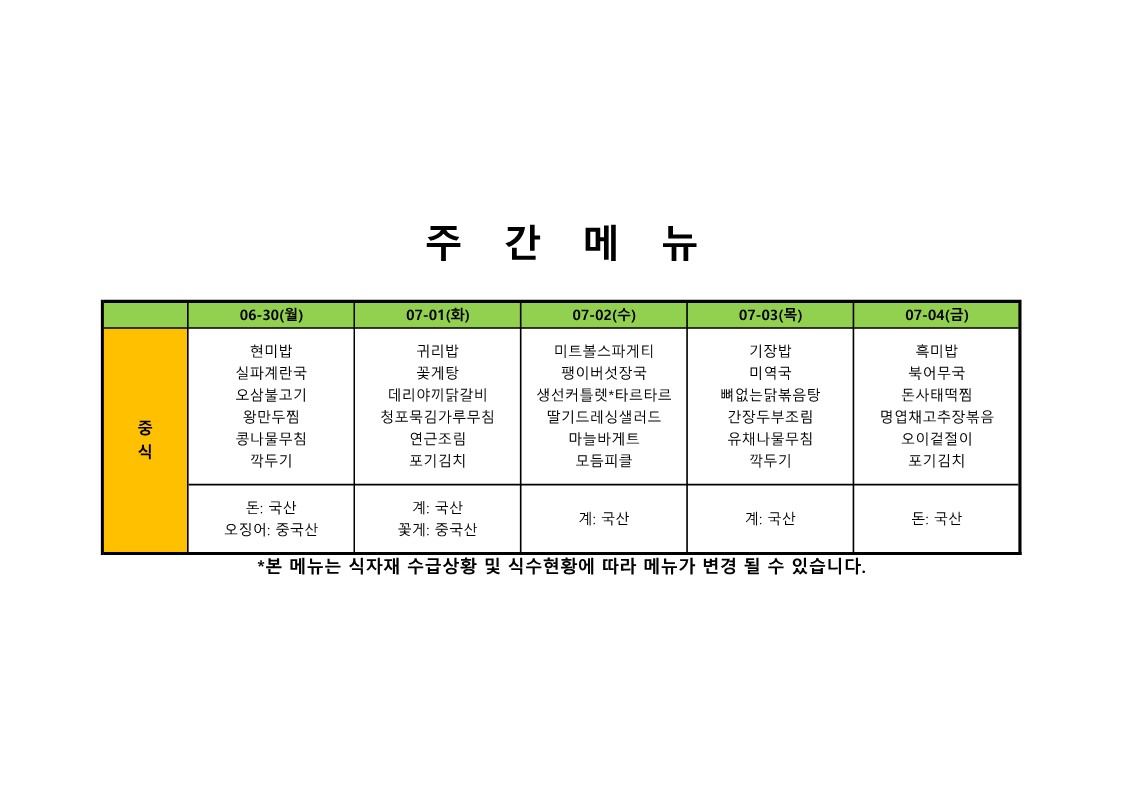 2024. 6. 24. ~ 2024. 6. 28. 주간식단표