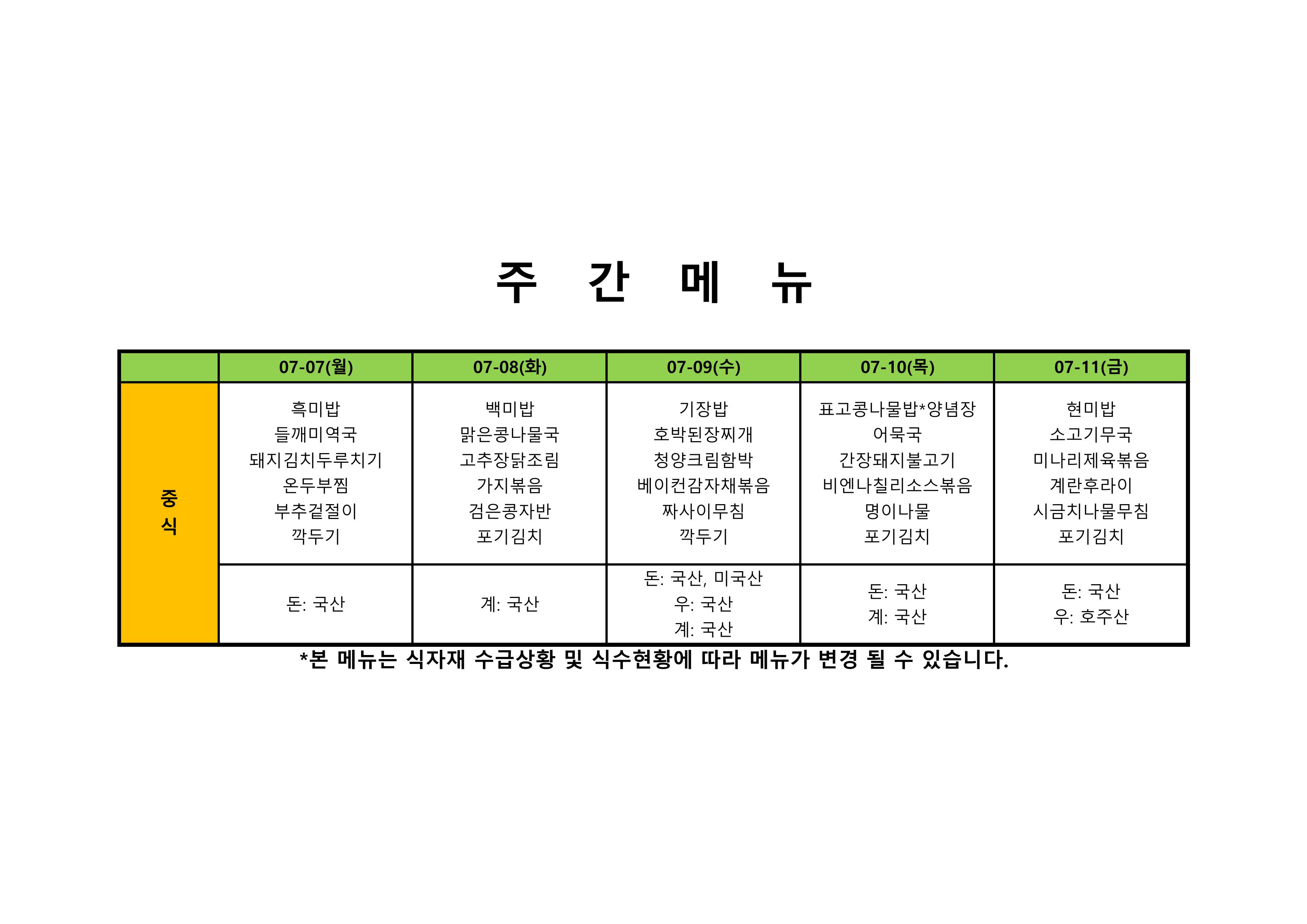 2024. 7. 15. ~ 2024. 7. 19. 주간식단표