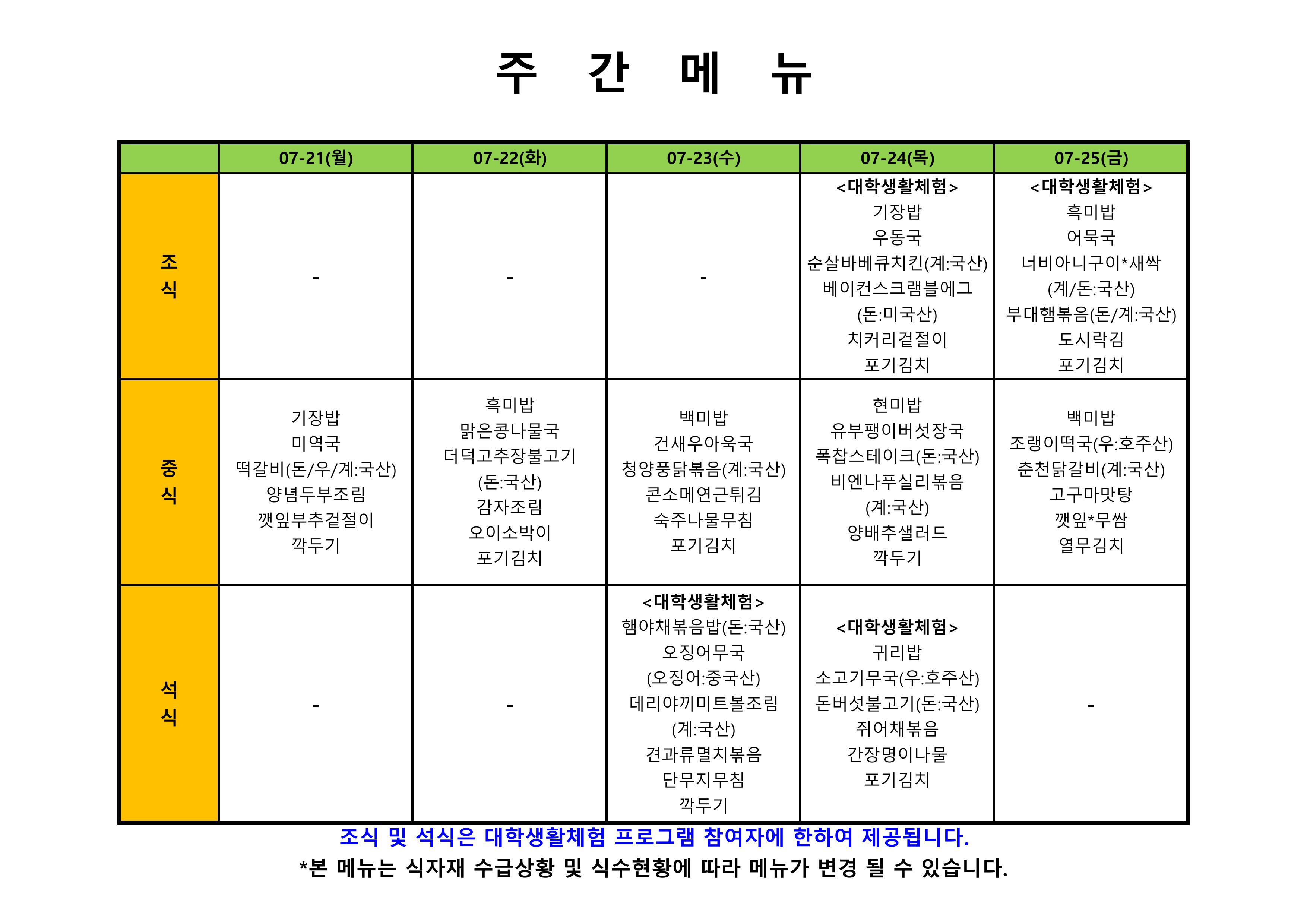 68 2025. 7. 28. ~ 2025. 8. 1. 주간식단표 학생생활관(분원) 2025.07.25 51287