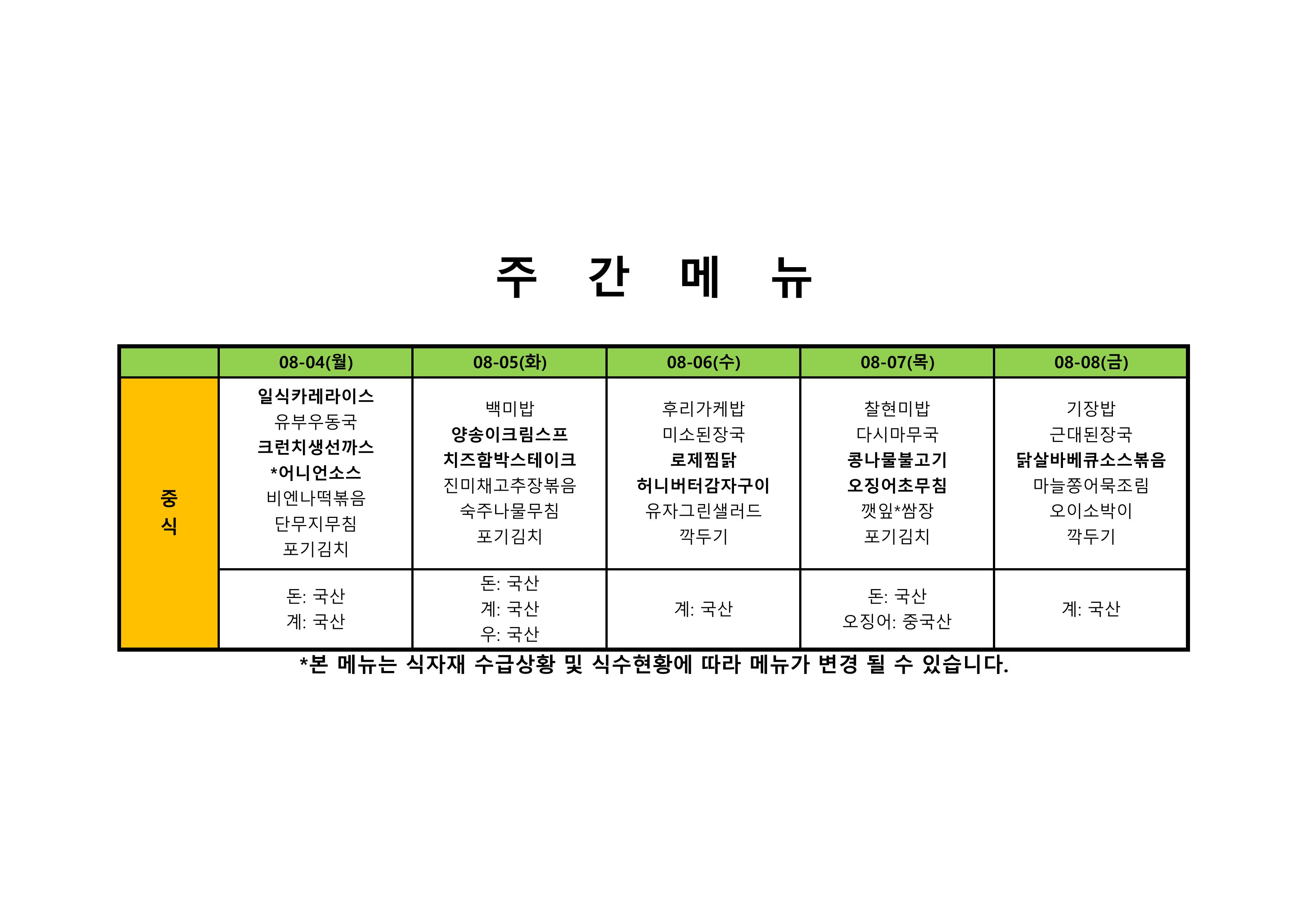 2026. 1. 5. ~ 2026. 1. 9. 주간식단표