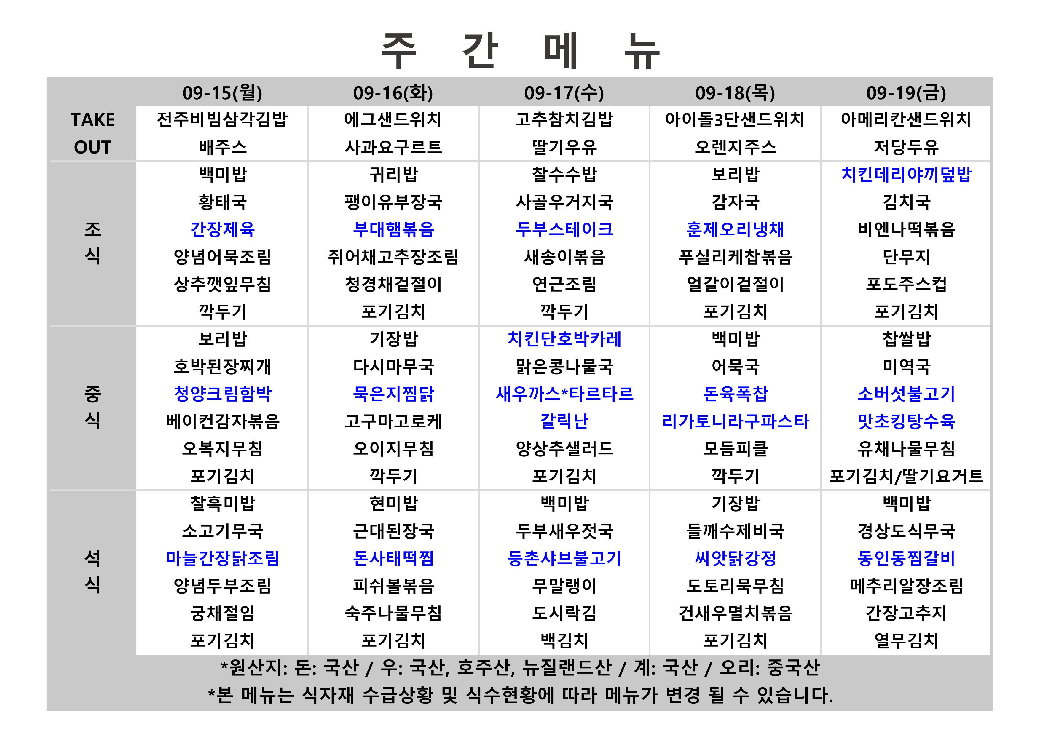2024. 7. 15. ~ 2024. 7. 19. 주간식단표