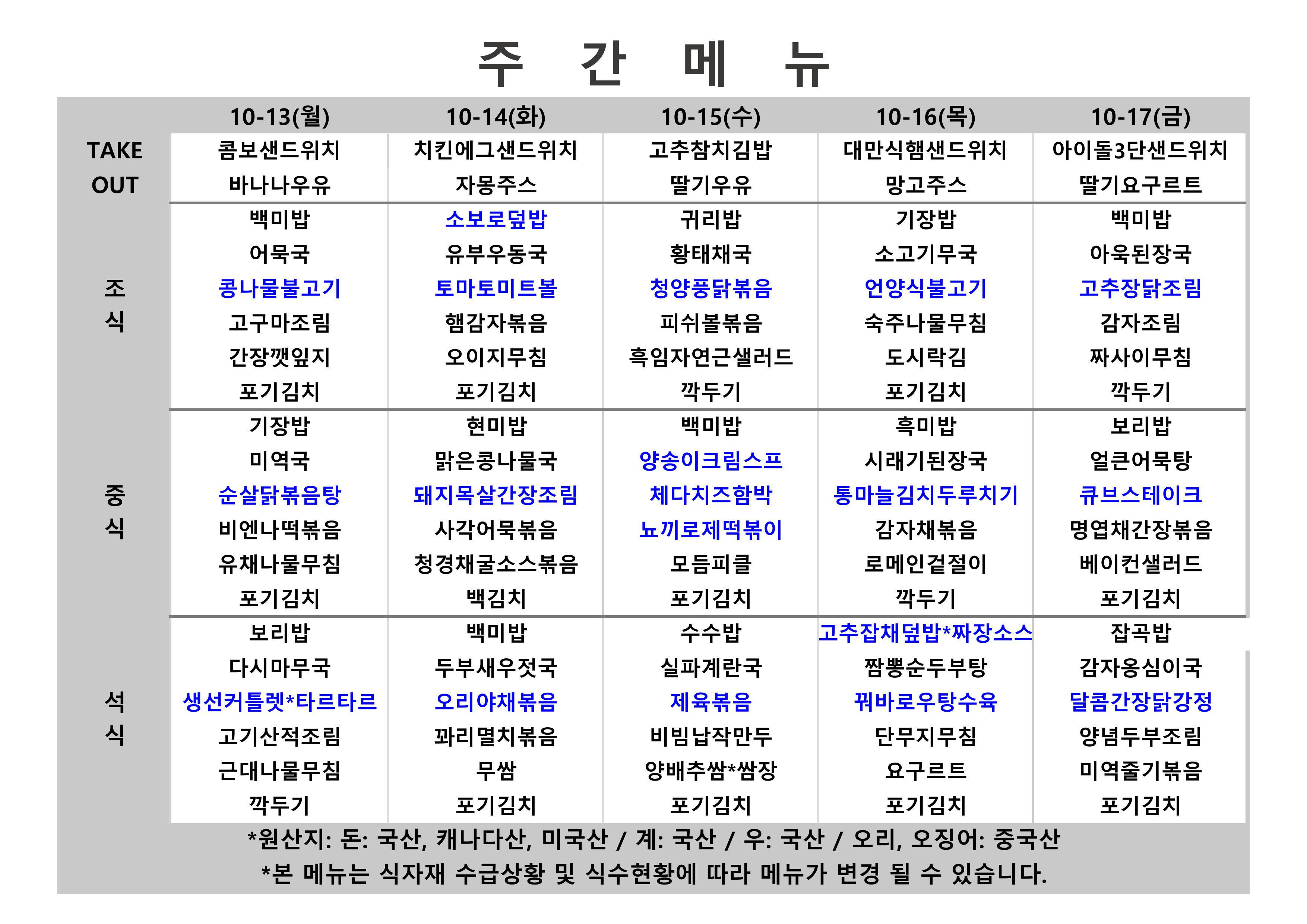 2025. 10. 13. ~ 2025. 10. 17. 주간식단표