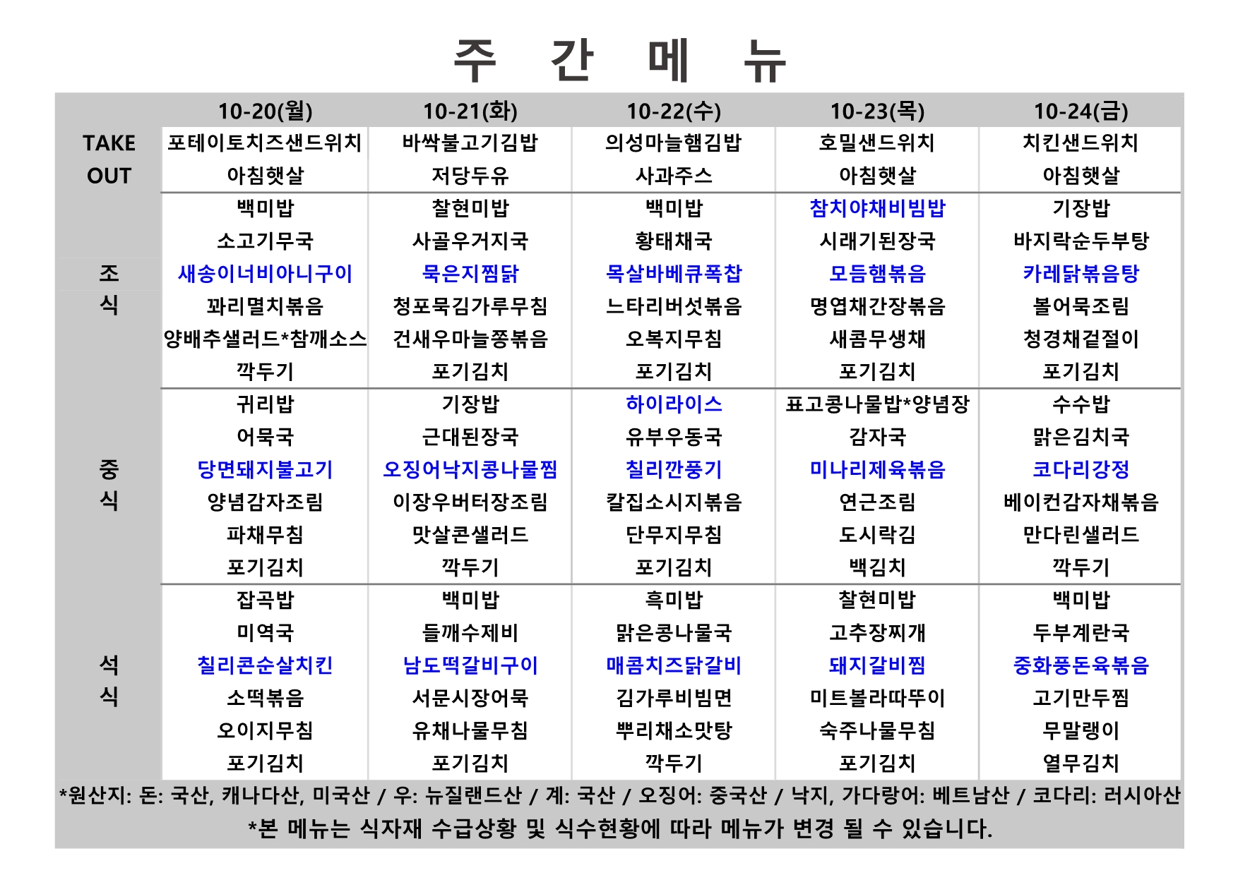 2025. 10. 20. ~ 2025. 10. 24. 주간식단표