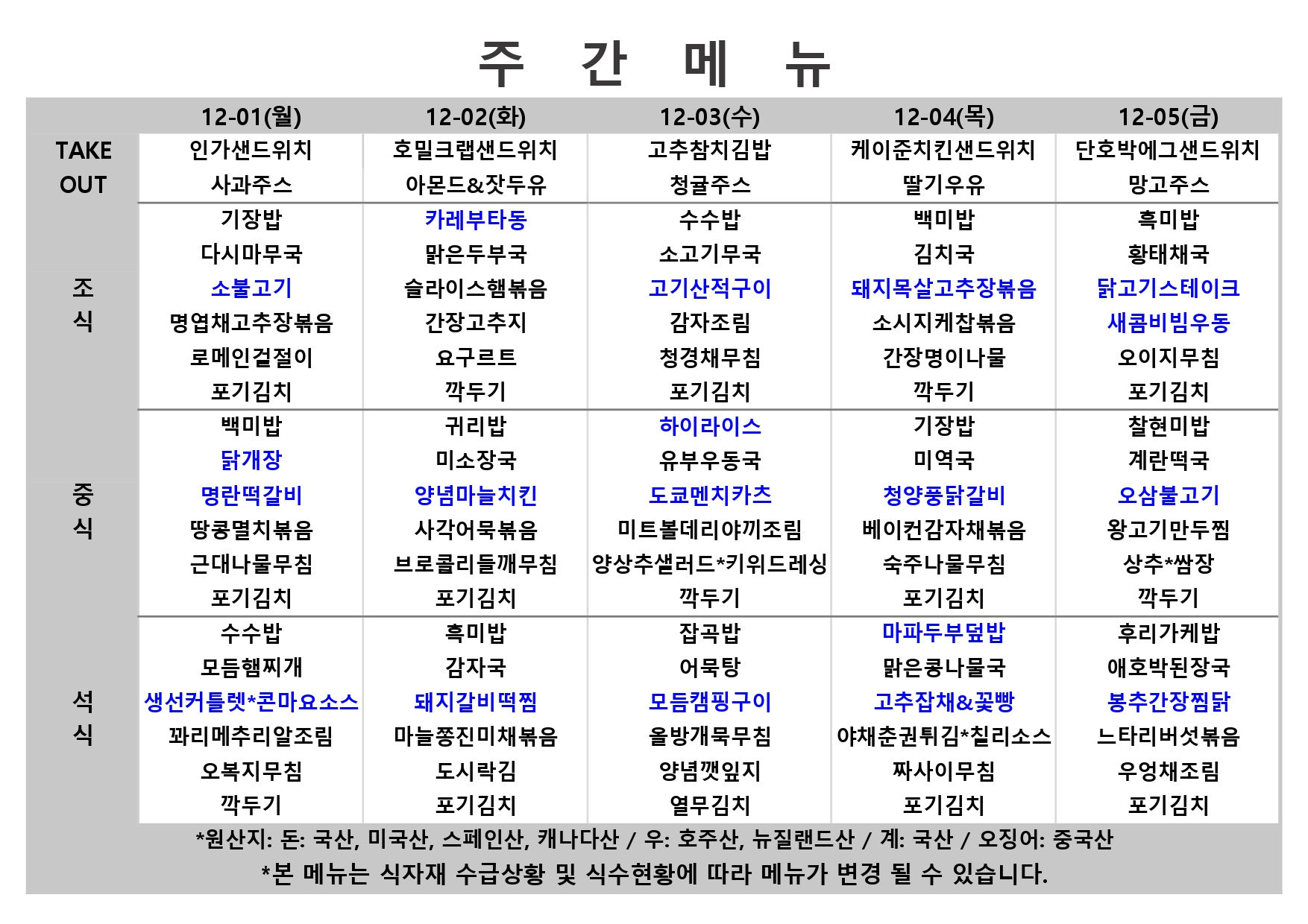 2025. 12. 1. ~ 2025. 12. 5. 주간식단표