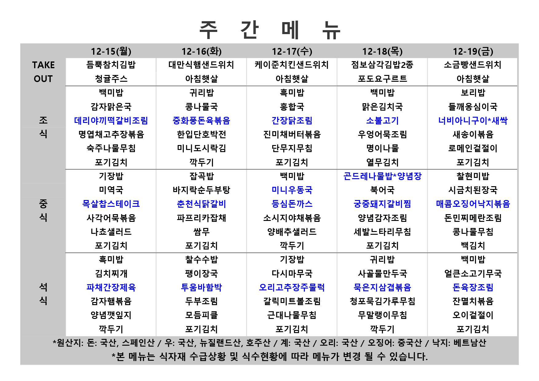 2025. 12. 15. ~ 2025. 12. 19. 주간식단표