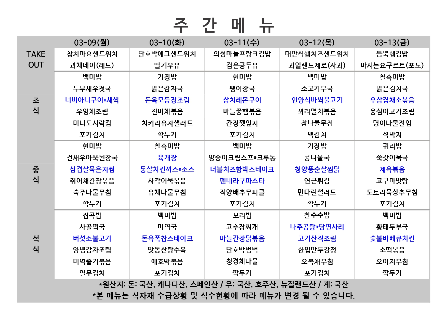 2026. 3. 9. ~ 2026. 3. 13. 주간식단표